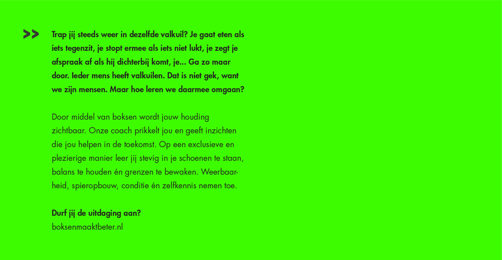 Teuno Blankesteijn – BokscoachHet ontwerpproces Teuno had gelijk al heel duidelijk wat zijn doel is en waar de passie in zit. Om tot een concreet verhaal en concept te komen, maar vooral een passende stijl, schakelde hij de hulp van Studio Vierkant in. Na een uitgebreide kennismaking en brainstormsessie werd helder waar de kern van zijn missie zit. Gekoppeld aan de kernwaarden menswaardig, prikkelend en oprecht werd zijn identiteit meer en meer helder. Er was een kader, maar deze moest nog ingekleurd worden. Studio Vierkant ontwierp drie moodboards met een klein verschil in de focus, zoals de doelgroep en de balans tussen het helpen en het sportieve. Één moodboard werd het startpunt met uiteindelijk deze energieke en dynamische stijl!