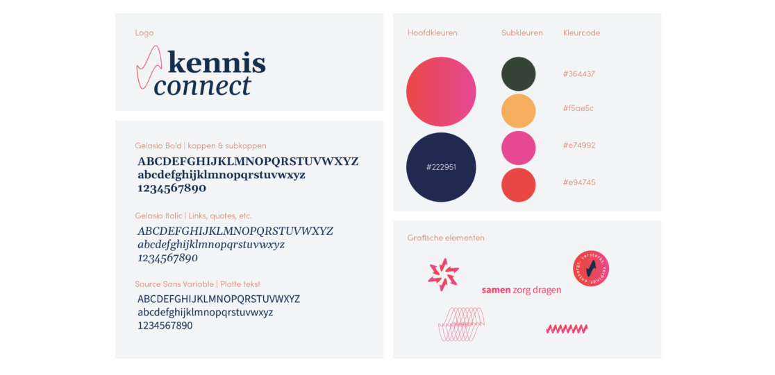 Vanuit onderzoek en brainstorm ontstond een merkidentiteit, concept en een positionering. We deden onderzoek naar onder andere de doelgroep, het vakgebied en de doelen van Kennis Connect. Deze inhoud is vertaald naar beeld. De kern ‘samen zorg dragen’ is de basis geworden voor het hele ontwerp en straalt het energieke karakter van Kennis Connect uit. Plezier, passie en hartgrondig zijn de kernwaarden die in alles wat ze doen te zien zijn.
