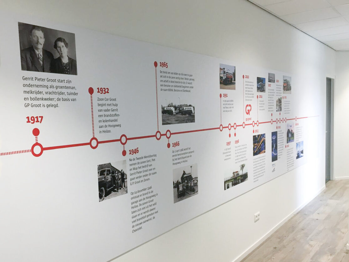 In opdracht van InterieurlabC heeft Studio Vierkant deze timeline ontworpen voor GP Groot. Een familiebedrijf met een geschiedenis die in 1917 startte en zich ontwikkelde tot wie ze nu zijn. Een ontwerp van maar liefst zes meter lang in de huisstijl van de organisatie, gerealiseerd naar de wensen van de klant.